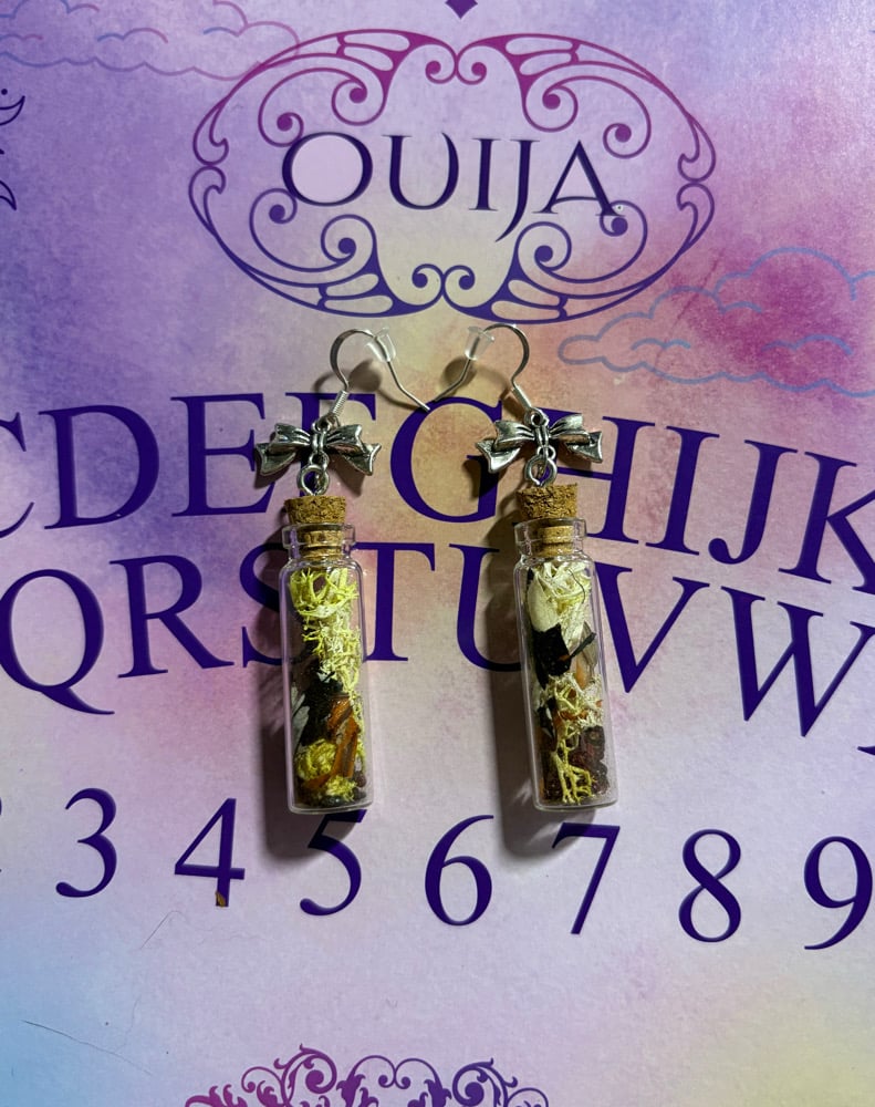 Glass bottle earring set with real butterfly wing fragments, moss and Garnet chips.