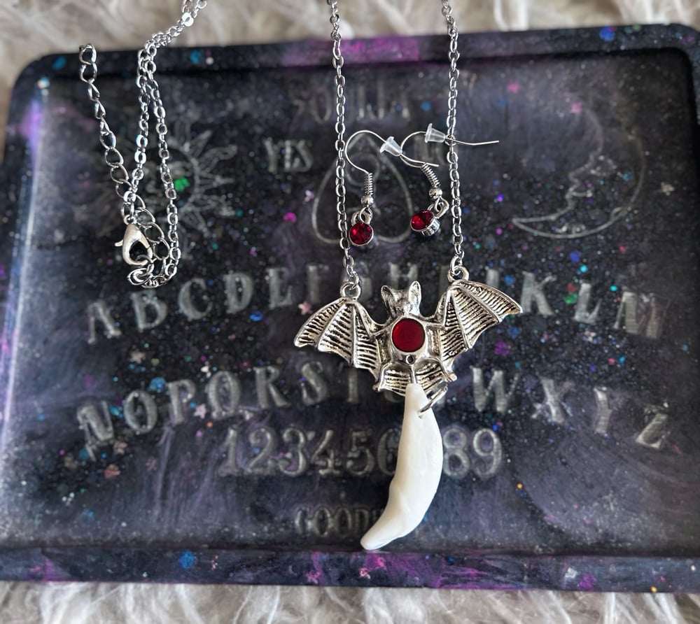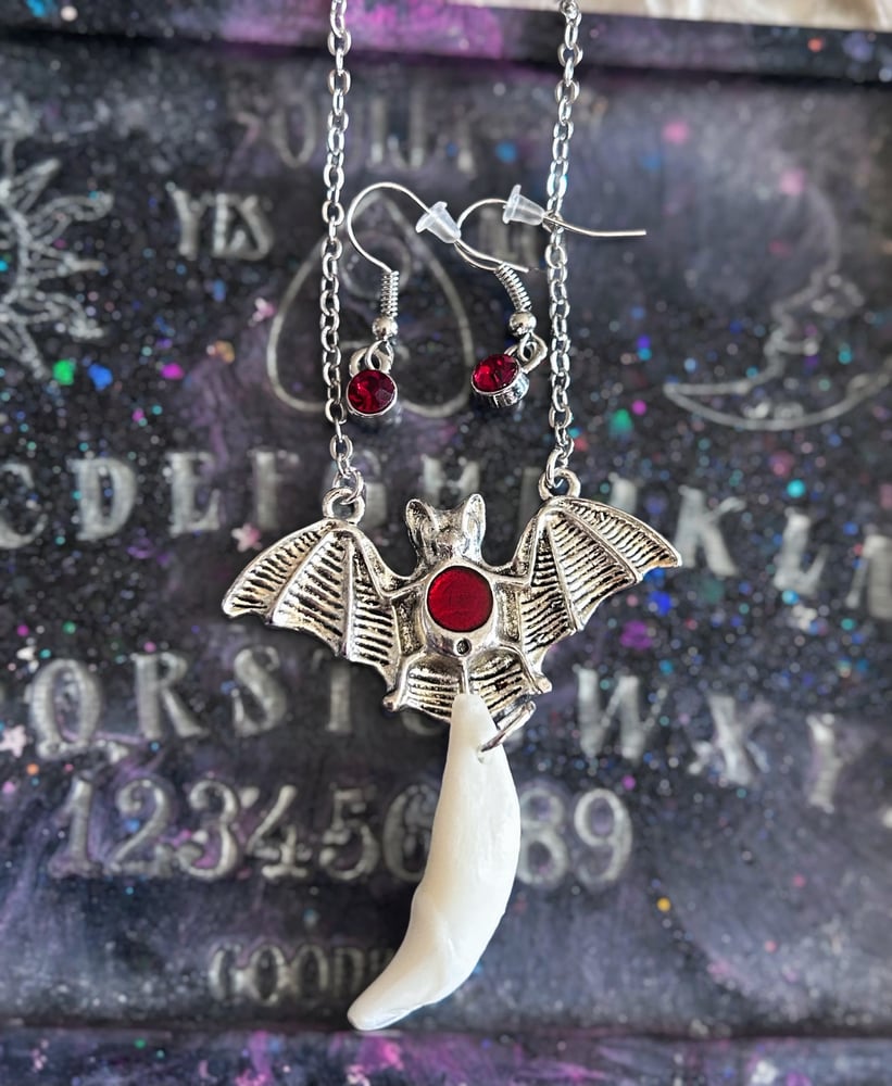 Bat charm necklace with a dangling coyote fang. Comes with red detailed earrings to match the red detailing on the bat.
