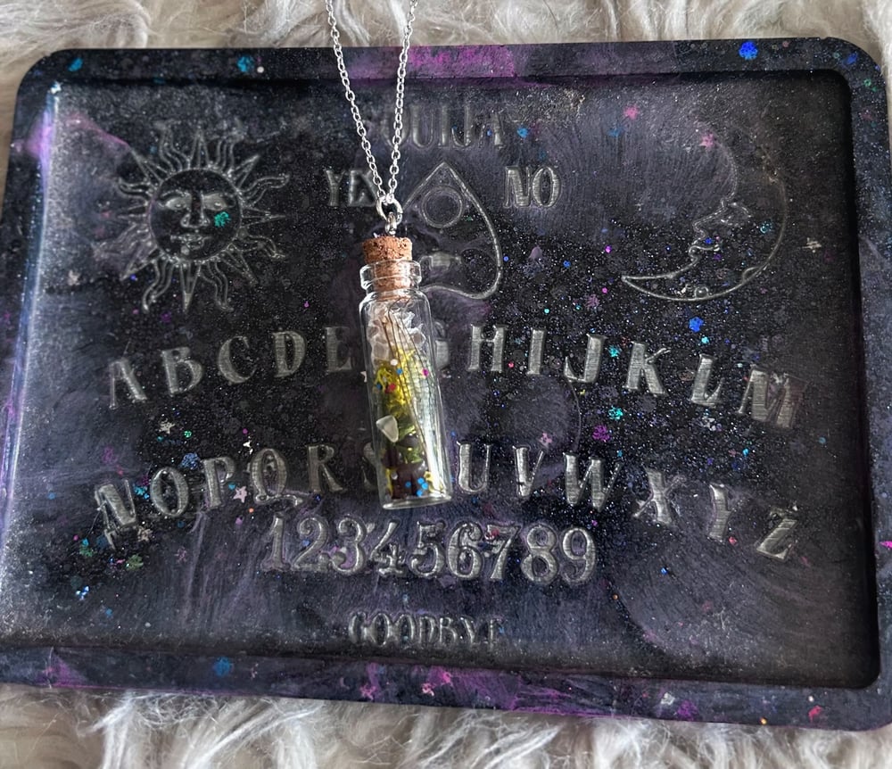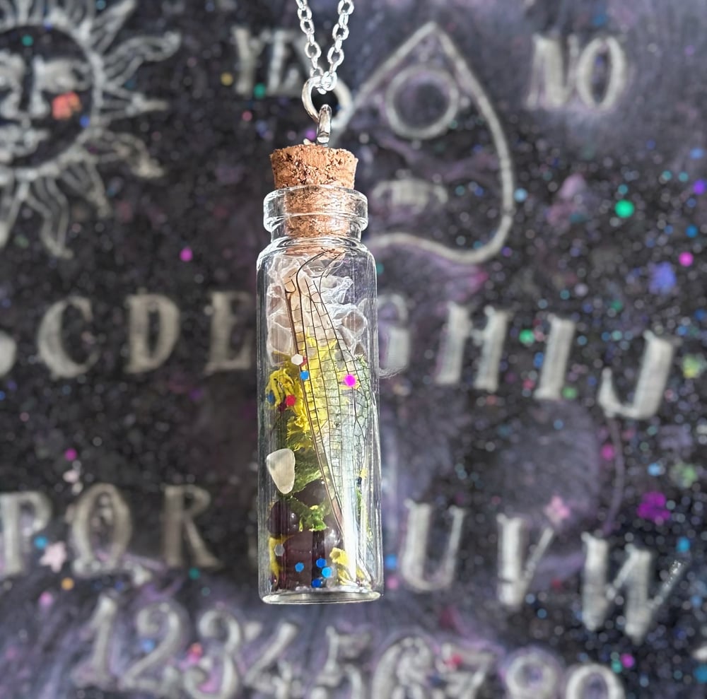 Glass bottle pendant necklace featuring a real dragonfly wing, glitter, faux moss, real snake shed from a python and Garnet shards.