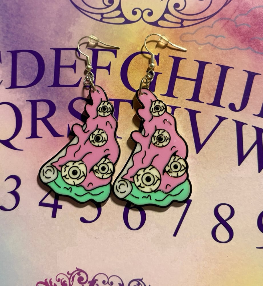 Acrylic charms made into earrings that feature a pizza slice with a topping of eyeballs. Earrings measure approximately of 3 inches in total length.