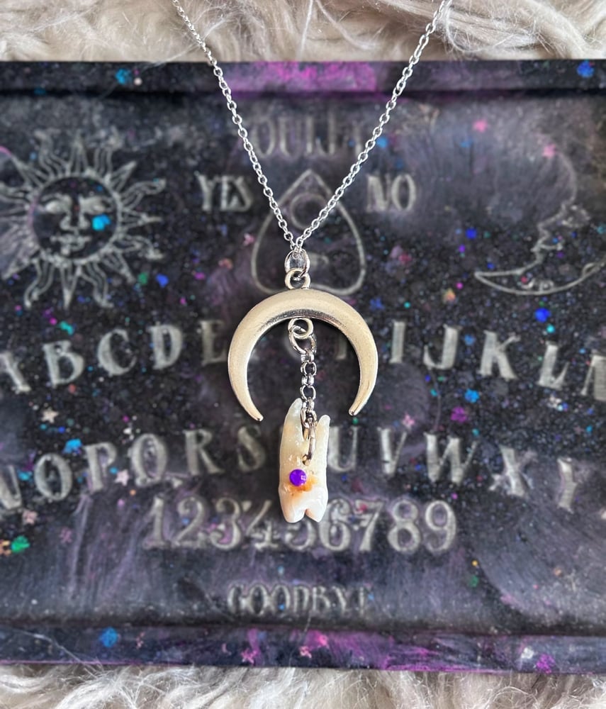 Real human tooth necklace dangling off of a moon shaped pendant. Includes a lil rhinestone attached to the tooth for extra flair.