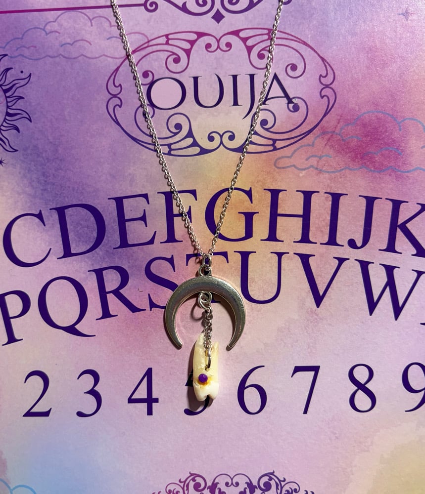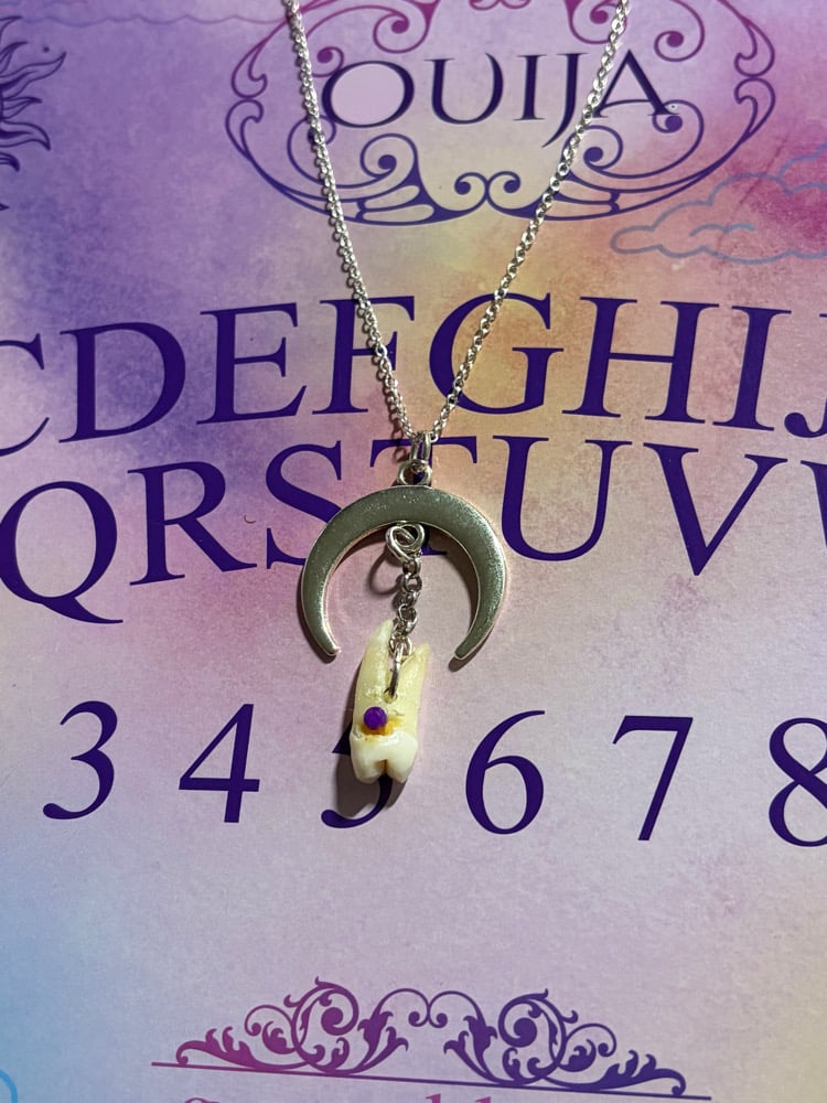 Unique shaped pendant similar to a crescent moon featuring a real human tooth with a purple rhinestone on top.