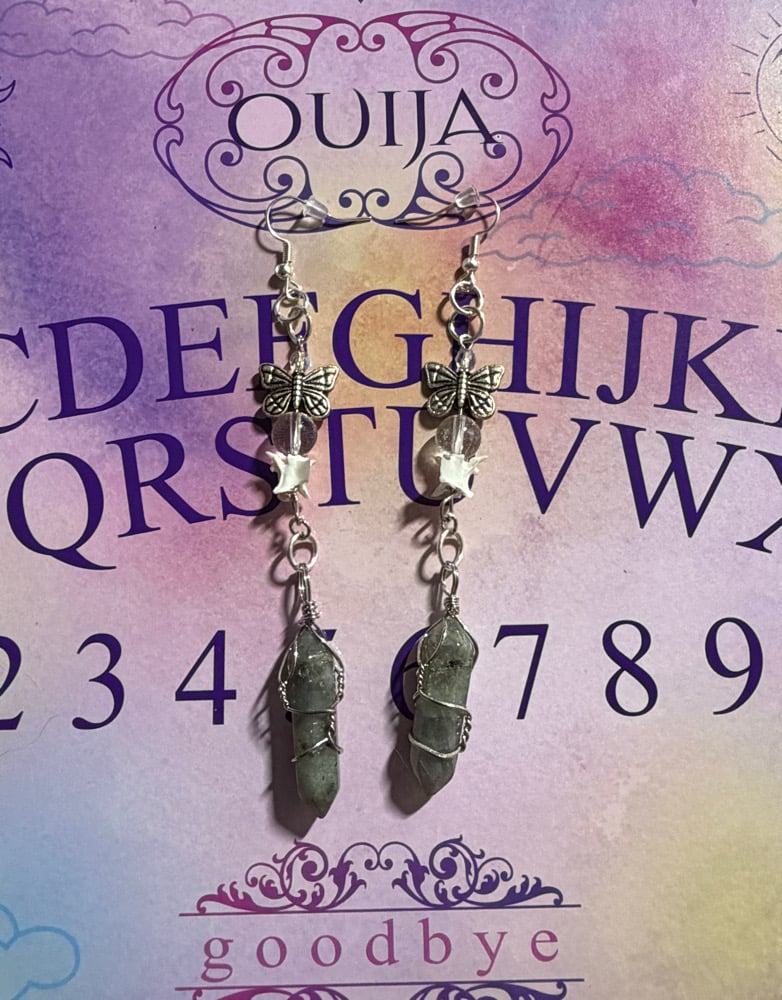 Dangly earrings featuring snake vertebrae, assorted beads including butterfly beads and Labradorite prism pendants.