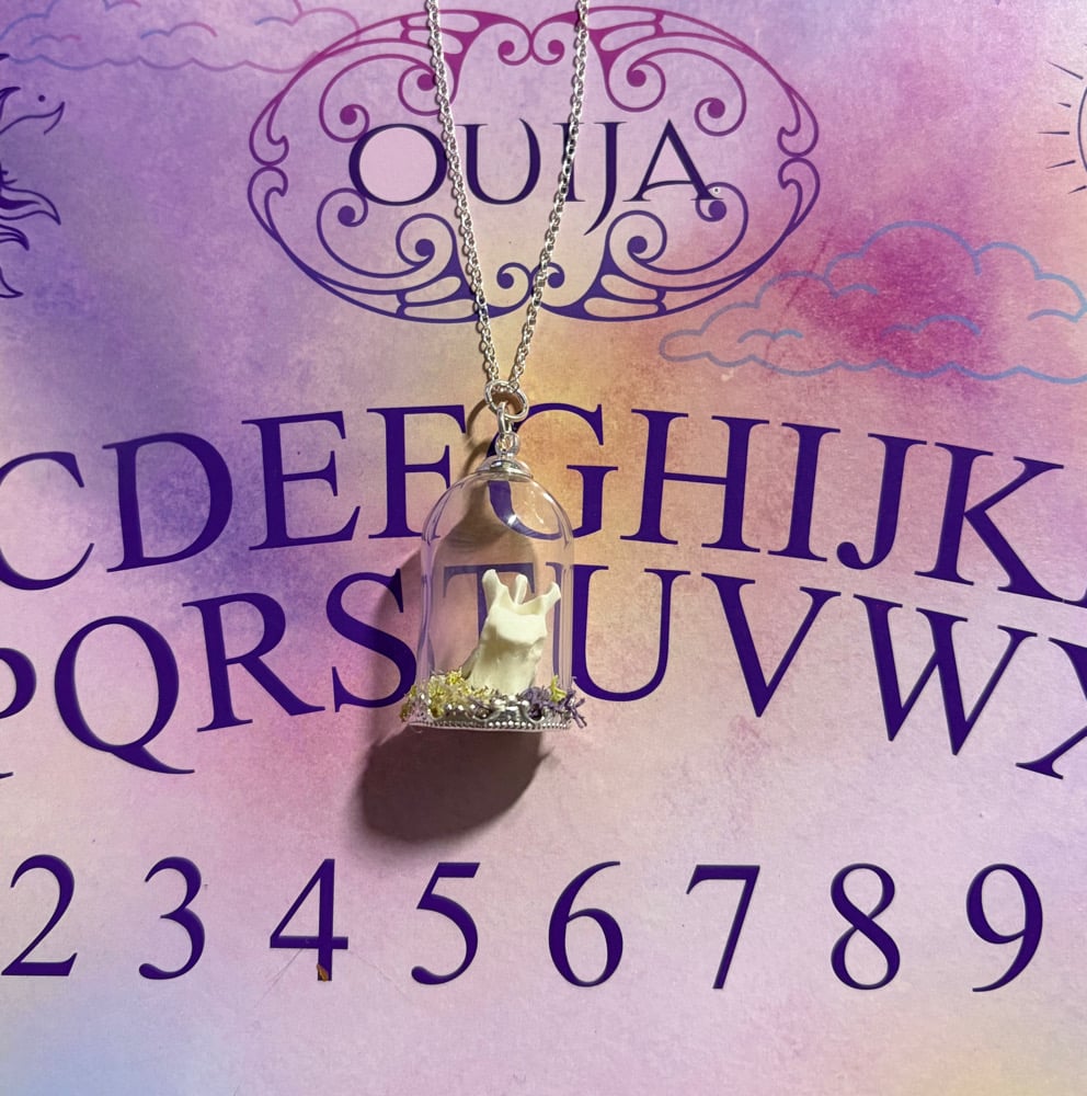 Glass pendant necklace with a real mink vertebrae and moss inside.