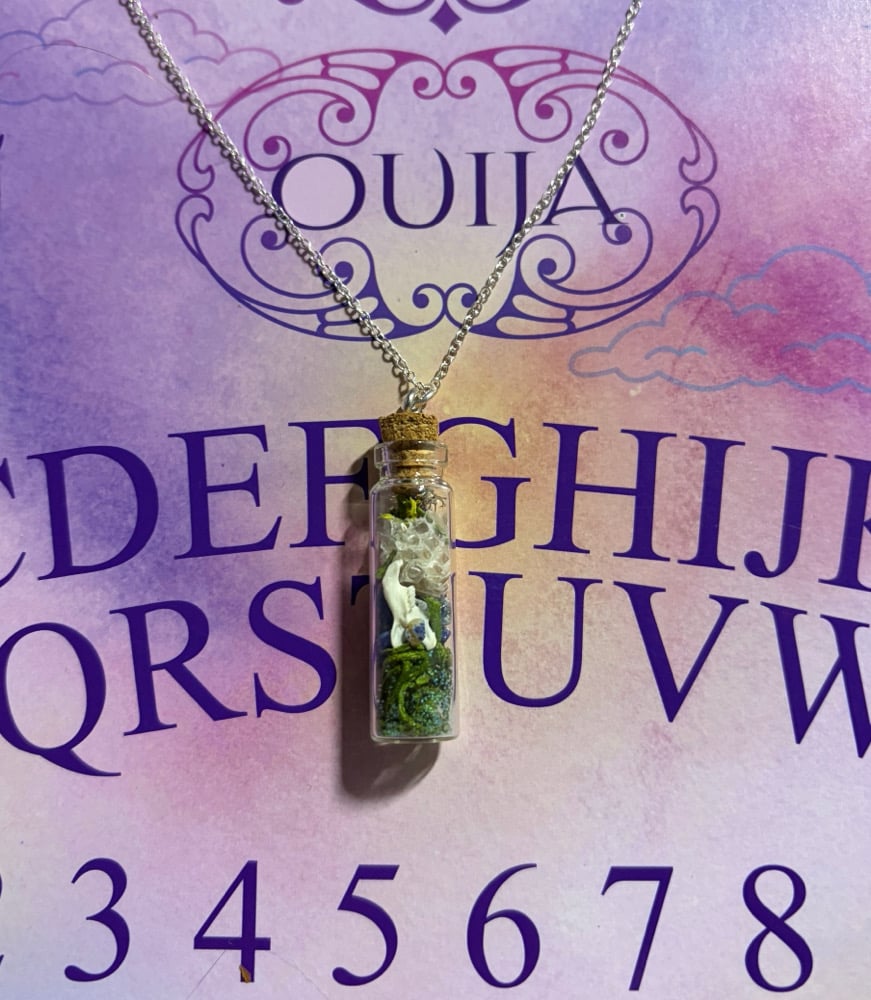 Glass bottle necklace with a real mouse jaw, glitter, snake shed, moss and Lapis Lazuli chips.