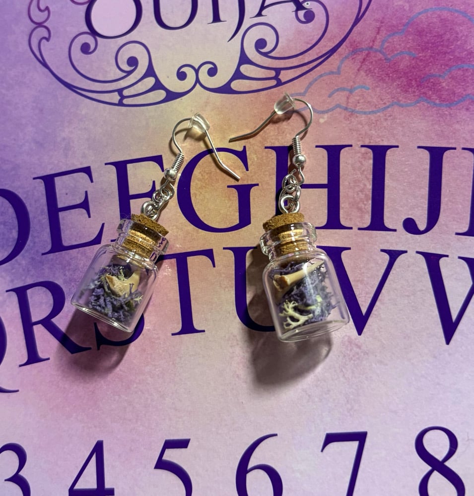 Earrings featuring glass bottles with real shark teeth and an assortion of colored moss inside. These earrings measure approximately 2 inches in total length.