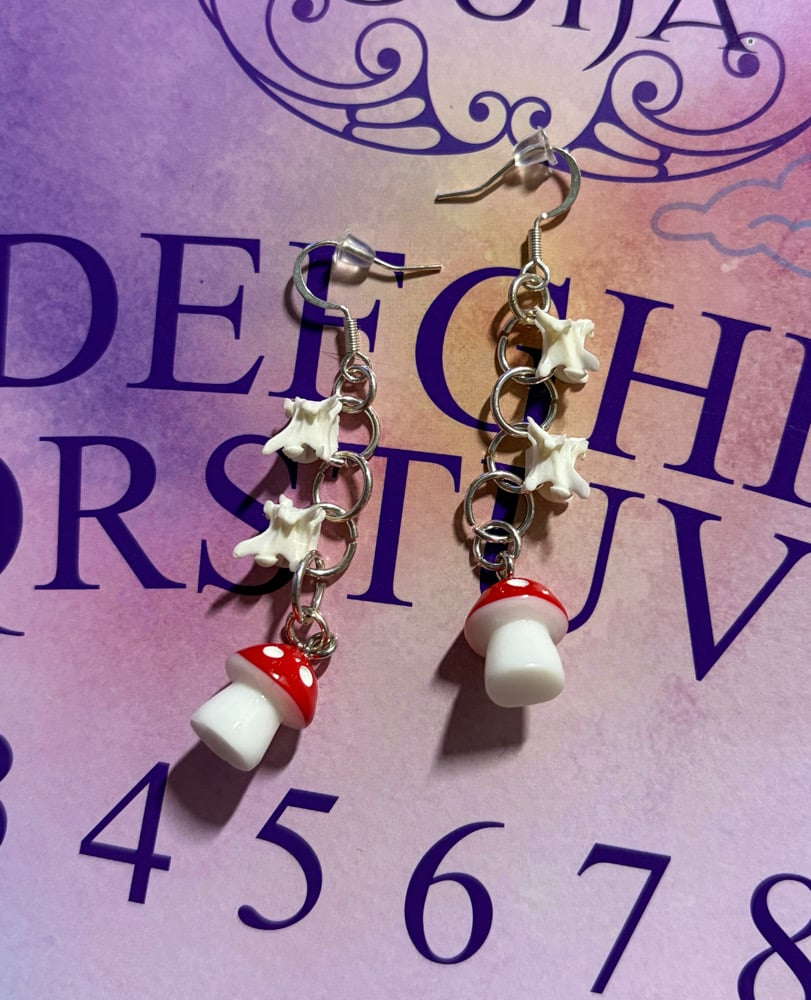 Dangly chain earrings with real snake vertebrae and mushroom charms attatched.
